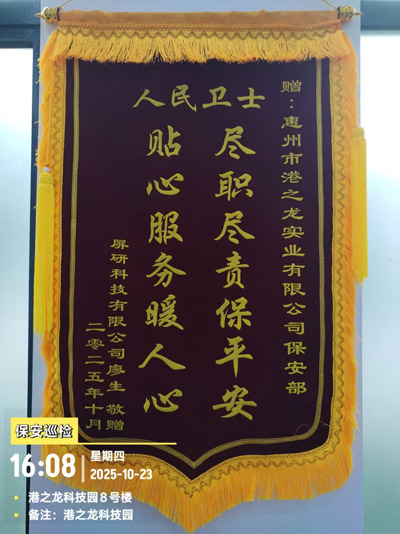 鐵保宏泰深圳保安公司安保隊員協助屏研科技追回被盜物品的行動,盡顯責任擔當與服務熱忱,特此港之龍屏研科技深表感謝致送"盡職盡責保平安 貼心服務暖人心"保安部錦旗。